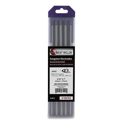 E3 Tungsten Electrode, 3/16 in dia x 7 in L, 5 PK